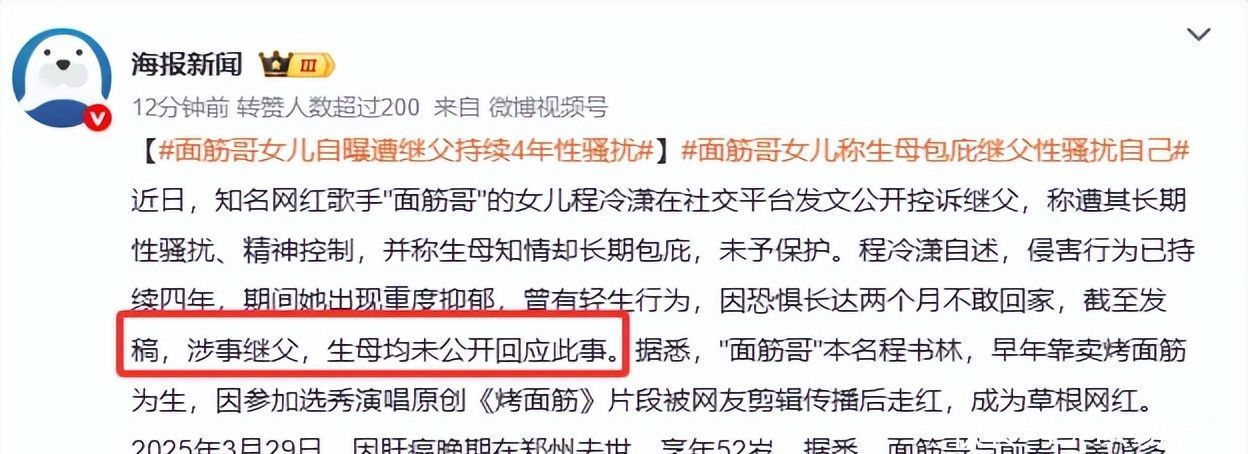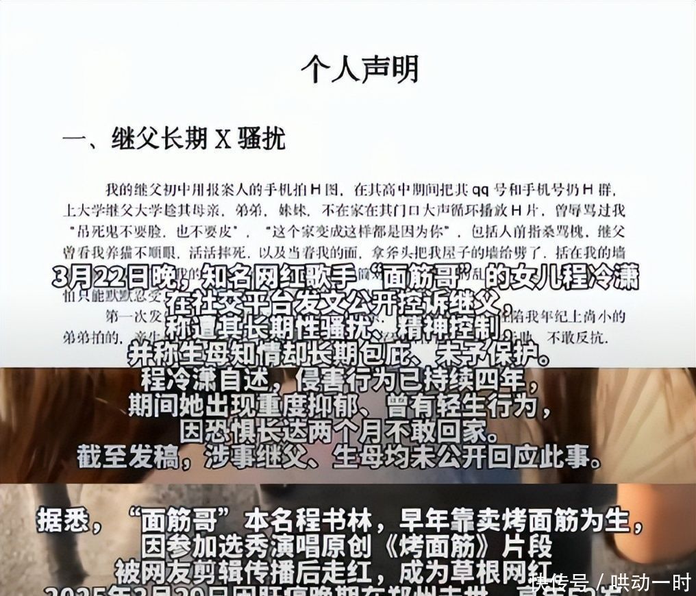 3月24日,“#面筋哥女儿自曝遭继父长达四年性骚扰#”空降微博热搜榜首。程冷潇发布的长文,字字如刀,句句带血,无数网友读罢掩面落泪,久久无法平静。